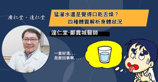 猛灌水還是覺得口乾舌燥?四種體質解析身體狀況-鄭貴城醫師 內科, 鄭貴城醫師By 站長2020 年 11 月 20 日不知道為什麼,總是無時無刻都感覺口渴,明明就已經喝很多水了,口乾舌燥的狀況還是停不下來?甚至早上起床時,喉嚨也…